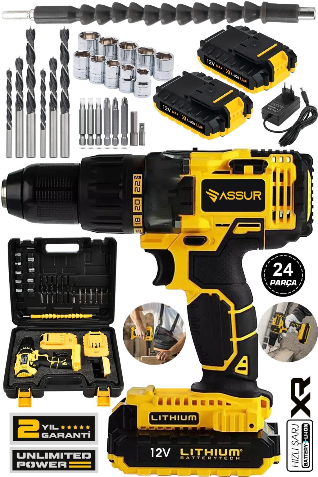 Assur 12V 1.5Ah Metal Şanzıman Çift Akülü Şarjlı Darbeli Matkap 24 Parça Akülü Vidalama