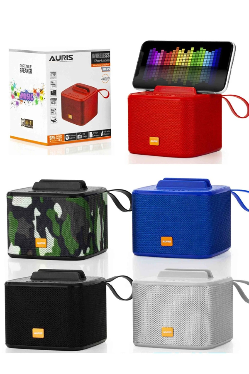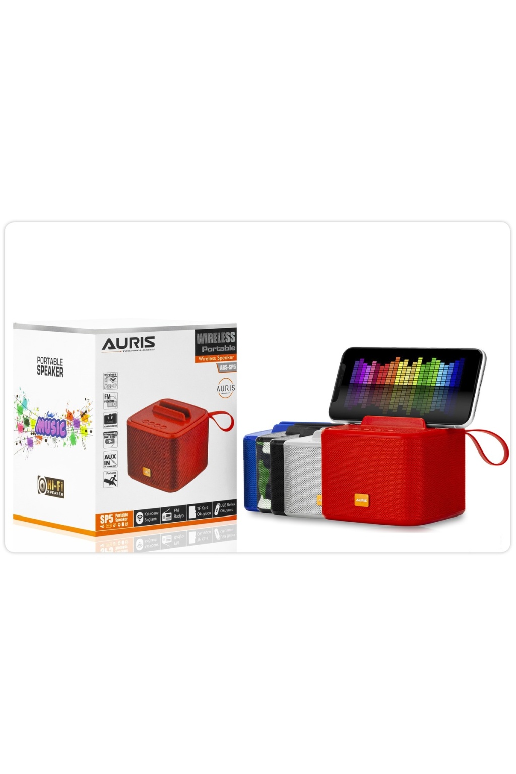 - Çok renkli tasarımı ile dikkat çeken Auris ARS-SP5 Bluetooth hoparlör, her ortama uyum sağlayacak şık bir görünüm sunar.; - 2 yıl resmi distribütör garantisi ile güvenilir kullanım imkanı tanır; olası teknik sorunlarda endişe etmenize gerek kalmaz.; - Suya ve tere karşı dayanıklı olmayan yapısıyla dış mekan aktivitelerinde veya su bazlı etkinliklerde ideal bir seçim değildir.; - Tek bir cihaza bağlanabilen çoklu bağlantı özelliği bulunmadığından, birden fazla cihazı aynı anda dinlemek isteyen kullanıcılar için uygun değildir.; - 5 ila 10 saat arasında değişen dinleme süresiyle uzun süreli müzik keyfi yaşamanızı sağlar; böylece kesintisiz eğlence deneyimi yaşarsınız.
