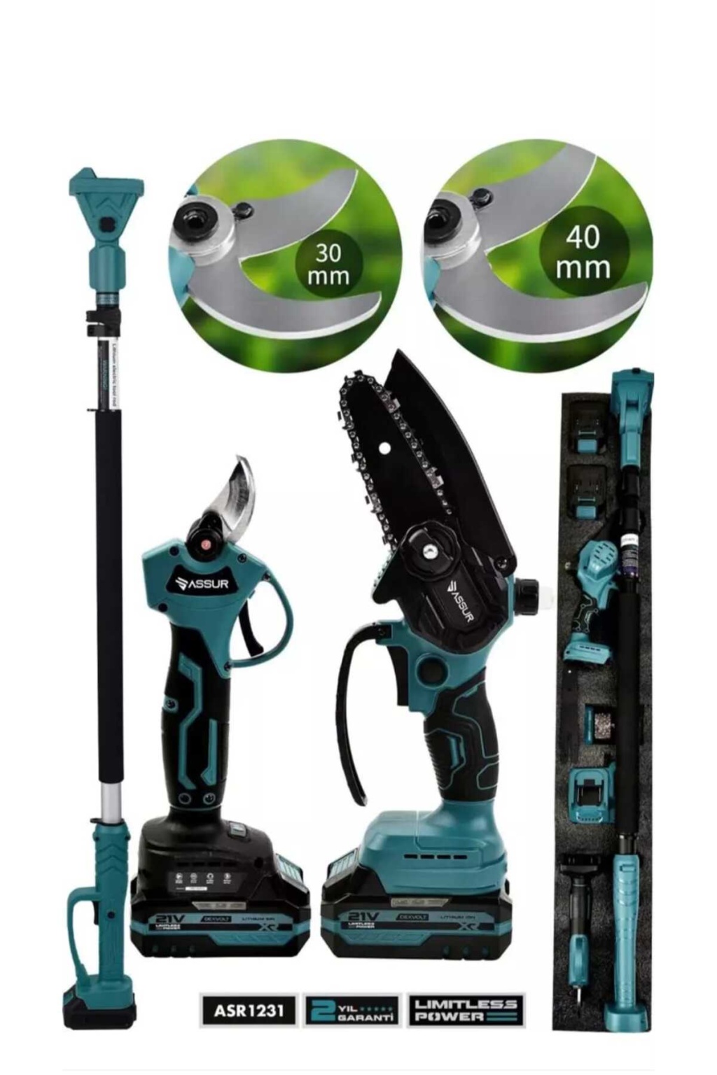 - **Kullanım Kolaylığı ve Uzun Ömür:** Şarj edilebilir özelliği sayesinde kesintisiz çalışma imkanı sunar ve uzun süreli kullanımlarda bile performansından ödün vermez.; - **Profesyonel Kalite:** Teleskopik kol tasarımı ile yüksek yerlere ulaşmanızı kolaylaştırırken, güçlü motoru sayesinde zorlu budama işlemlerinde bile üstün sergiler.; - **Çift Akülü Avantaj:** Yedek akü ile birlikte gelen bu set, şarjın bitmesi durumunda bile çalışmaya devam etmenizi sağlar ve işlerinizi aksatmadan tamamlamanızı mümkün kılar.; - **Yerel Üretim Güvencesi:** Türkiye'de üretilen bu ürün, yerel üretim kalitesini ve güvenilirliğini temsil eder.; - **Kolay Temizlik ve Bakım:** Nemli bir bezle kolayca temizlenebilir yapısı sayesinde hijyenik kullanım sunar ve bakımının pratik olmasını sağlar.;