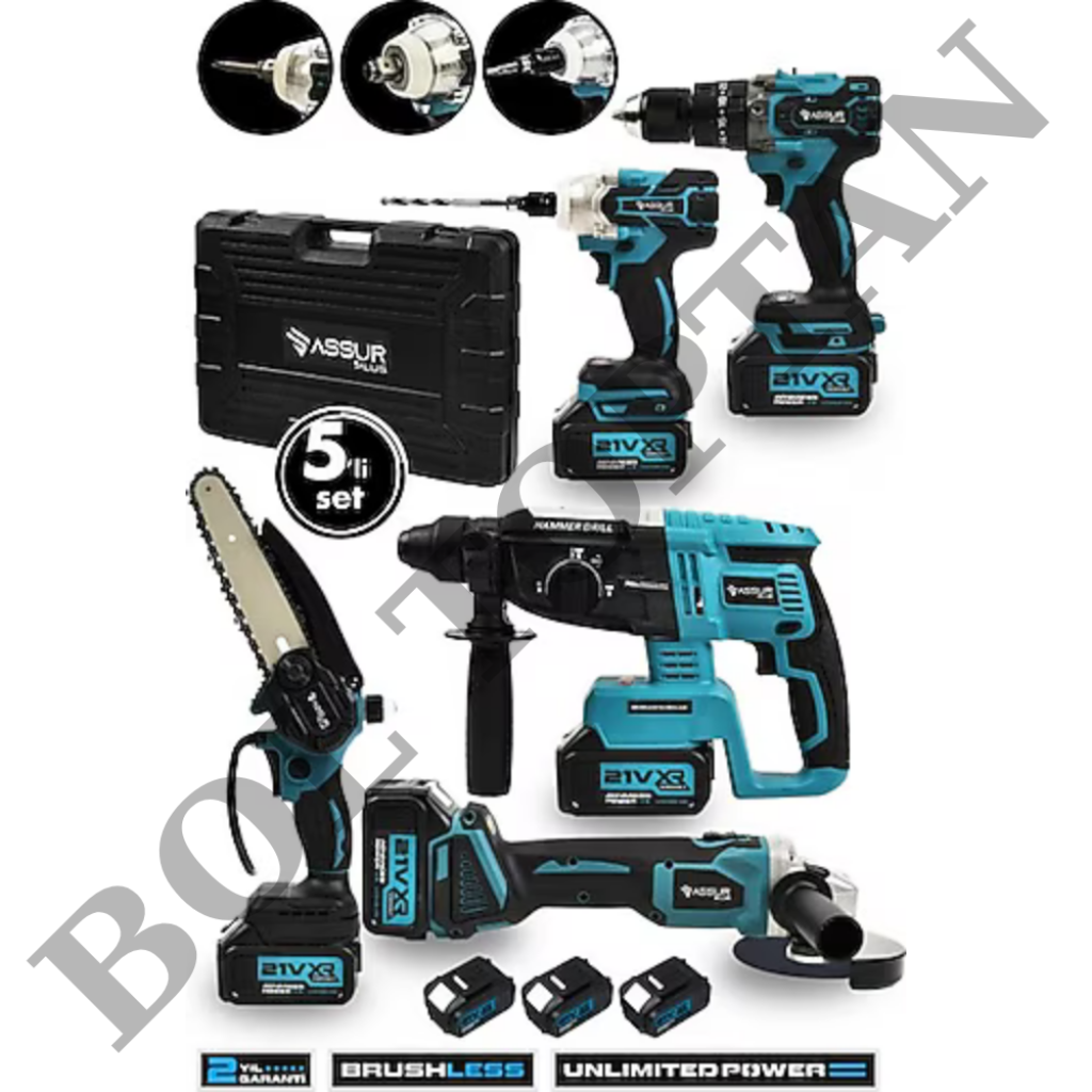 Assur 5'li akülü set, inşaat, tadilat, montaj, otomotiv, bahçe ve atölye işleriniz için tasarlanmış çok yönlü ve güçlü bir akülü el aleti setidir. Set, bir adet taşlama makinesi, bir adet darbeli somun sıkma makinesi, bir adet kırıcı delici hilti, bir adet darbeli vidalama makinesi ve bir adet budama testeresi içerir. 21v xr li-Ion güçlü bataryası ve kömürsüz motoru (taşlama, somun sıkma, hilti) sayesinde yüksek sunar. 2.0ah 3 adet aküsü ve 10 pilli dahili bataryası, uzun süreli kullanımlarda bile kesintisiz sağlar. 60 dakikalık hızlı şarj süresi, işlerinize hız kazandırır. Metal şanzıman ve çelik mandren, dayanıklılık ve uzun ömürlü kullanım sağlar. Optimize edilmiş soğutma sistemi, motorların aşırı ısınmasını önler ve performanslarını artırır. 2 konumlu kol, optimum kontrol sağlar. Led aydınlatma, karanlık ortamlarda bile rahat çalışma imkanı sunar. 10 kg'lık hafif tasarımı, kullanımı kolay ve pratiktir. 2 yıl garanti süresi, ürünün kalitesine ve dayanıklılığına olan güveni gösterir.